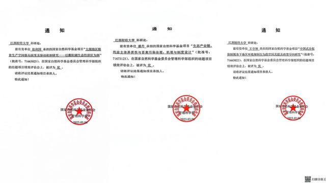 张利国教授承担的国家自然科学基金项目“大湖地区粮食生产空间格局演变及驱动机制研究——以鄱阳湖生态经济区为例”(批准号:71663025)、潘丹教授承担的国家自然科学基金项目“生态产业链、利益主体异质性与畜禽污染治理:机理与制度设计”(批准号:71673123)、王守坤教授承担的国家自然科学基金项目“中国式分权体制视角下地区环境规制行为的空间关联及政策导向研究”(批准号:71663022),在国家自然科学基金委员会管理科学部组织的结题项目绩效评估会上,均被评为 优 。