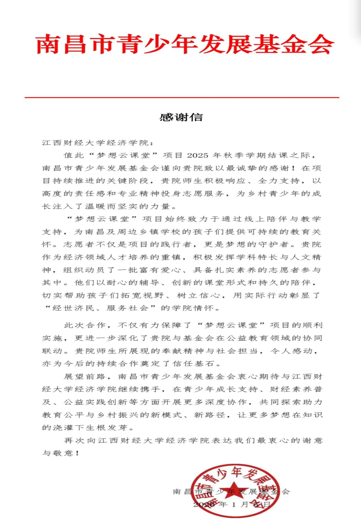 当专业知识的星火,遇见乡村少年的憧憬,一场关于成长的双向奔赴,在2025年的“梦想云课堂”里悄然绽放。2026年1月5日,电影天堂 收到南昌市青少年发展基金会发来的感谢信,字里行间的肯定,是这个冬日里最温暖的回响。