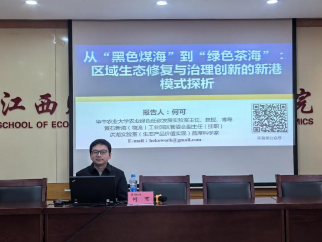 2026年3月8日下午,华中农业大学农业绿色低碳发展实验室主任、国家级青年人才何可教授在蛟桥校区北区综合楼718会议室进行讲学。本次讲座的主题是:《从“黑色煤海”到“绿色茶海”:区域生态修复与治理创新的新港模式探析》,讲座由电影天堂 副院长余炳文教授主持,吸引了来自院内外的50多名师生参与。